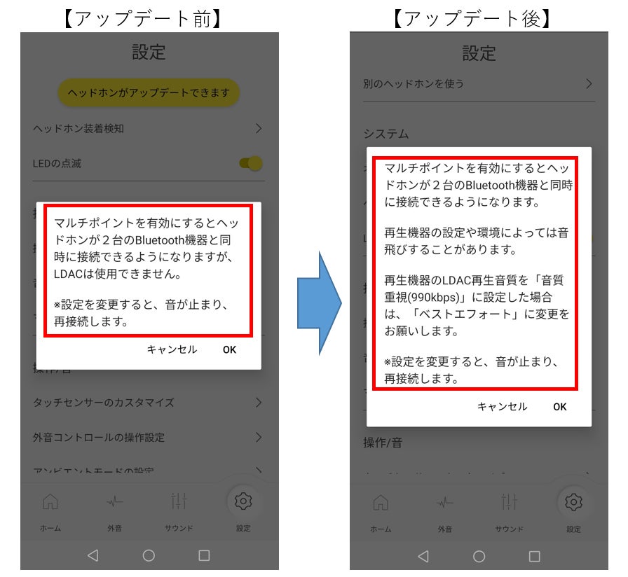 EAH-AZ60ではLDAC(TM)(※2)接続時のマルチポイント(※3)の使用が可能になります。また両機種共通で、イヤホン本体での音量調節時にスムーズに音量が変わるよう改善しました。本体のファームウェアのバージョンの確認方法や最新ファームウェアの更新方法は、2022年3月1日(火)13時より下記サポートサイトで公開します。