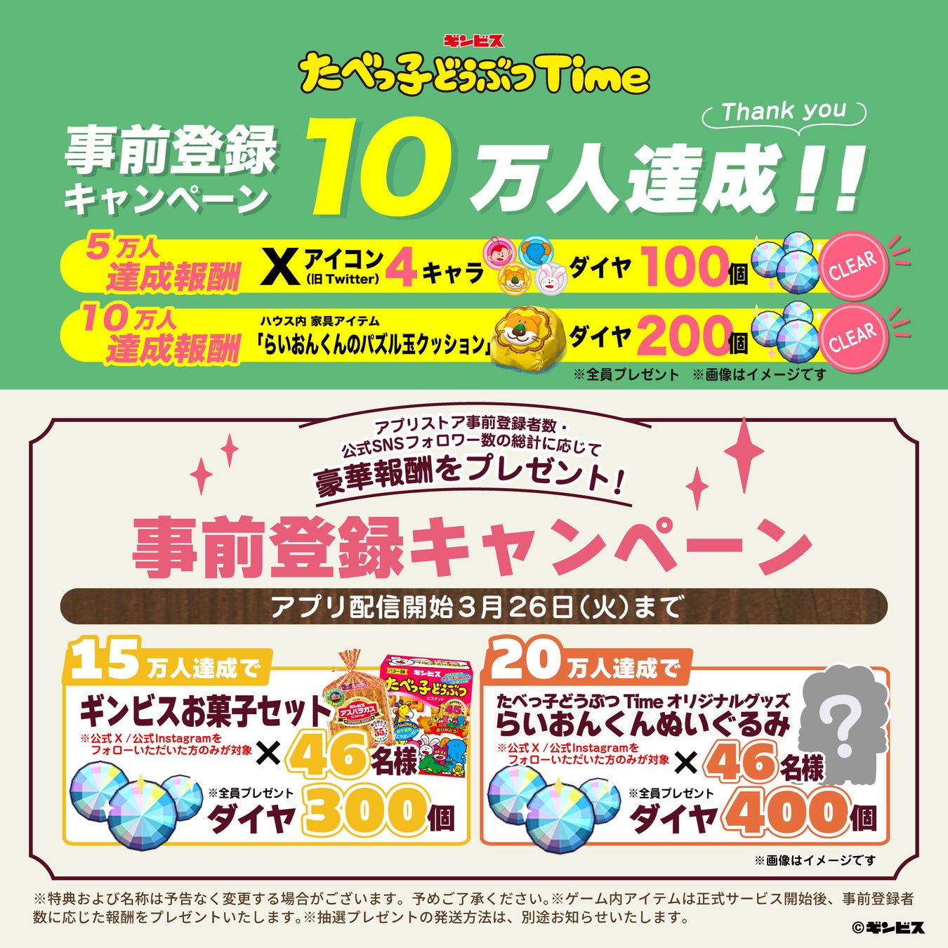 『たべっ子どうぶつTime』では、3月26日(火)まで「事前登録キャンペーン」を開催しており、公式SNS(X・Instagram)のフォローのほかアプリストアで事前登録いただくことでキャンペーンに参加いただけます(※1)。キャンペーンでは、事前登録者数(フォロワー数)に応じた豪華プレゼントをご用意しており、3月21日(木)現在事前登録者数は10万人を突破しております。