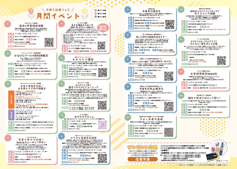内容:市や豊橋市子育て応援企業、子育て支援団体が子ども用品のリユースやスポーツ体験、子育て講座等の18 のイベントを開催します。