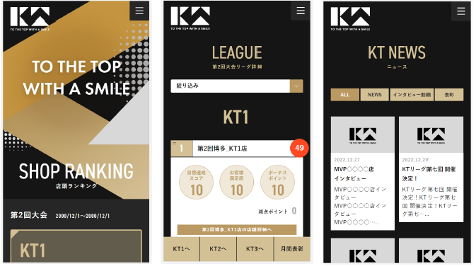応援したい店舗のランキングや、各リーグ上位の店長へのインタビューといった店舗情報、スポンサー企業様のご紹介など、KTリーグに関しての様々な情報を随時ご確認いただけます。