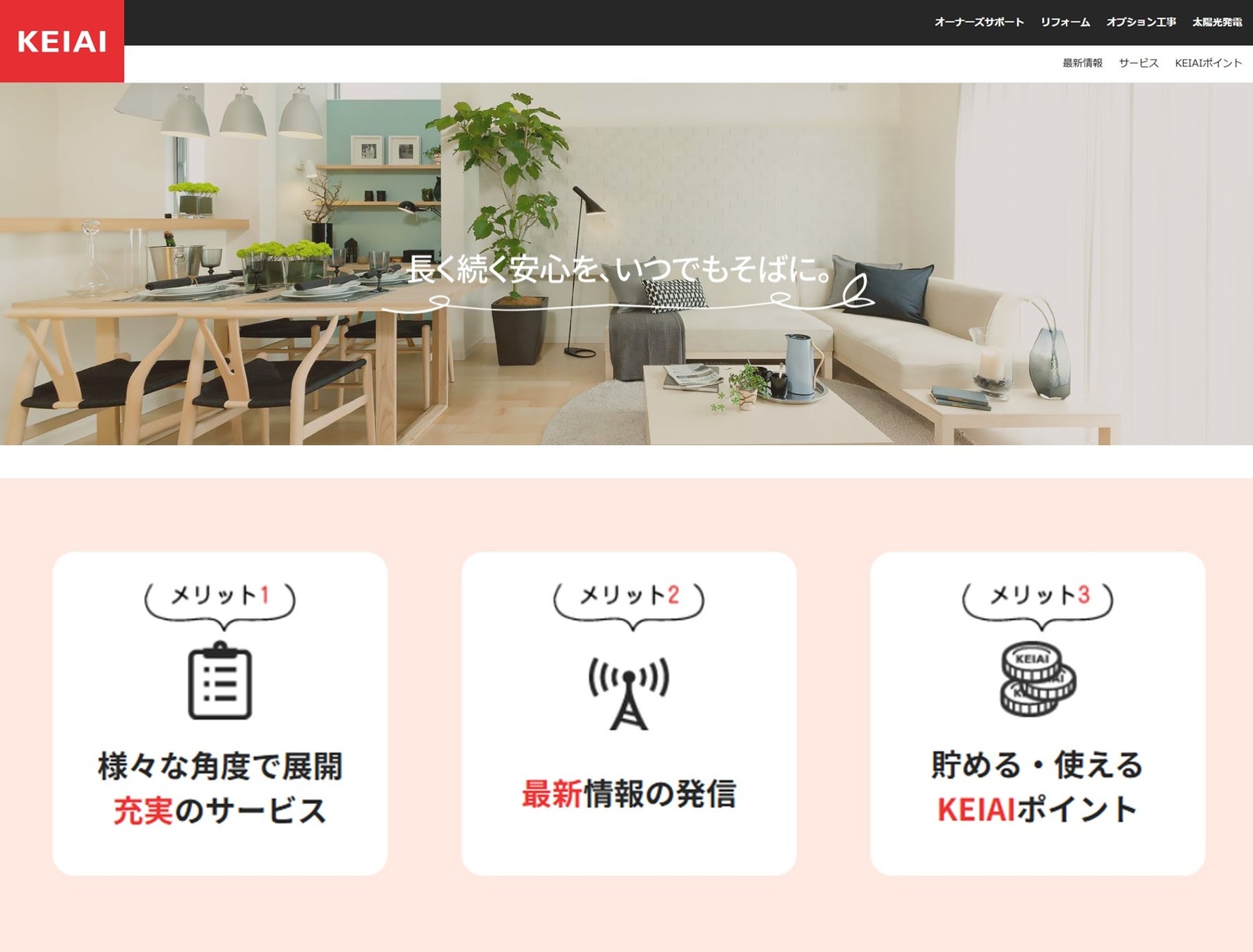 また、お客様のライフスタイルに応じた最適なサービスを提案するKEIAIコンシェルジュ、リフォームサービスの支払時に充当できるKEIAIポイント、修理・メンテナンスなど、オーナー様専用のサポートサービスを提供しています。