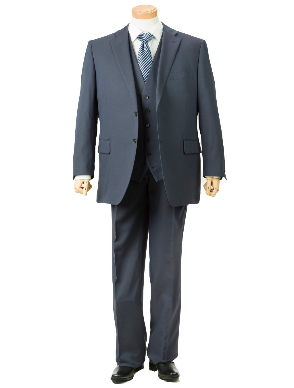 大きいサイズの店フォーエル、上品な質感を感じさせる光沢ある素材を使用した入学式や入社式などに人気の 3ピーススーツを発売。お手持ちのスーツをお洒落に演出するベストも発売中。