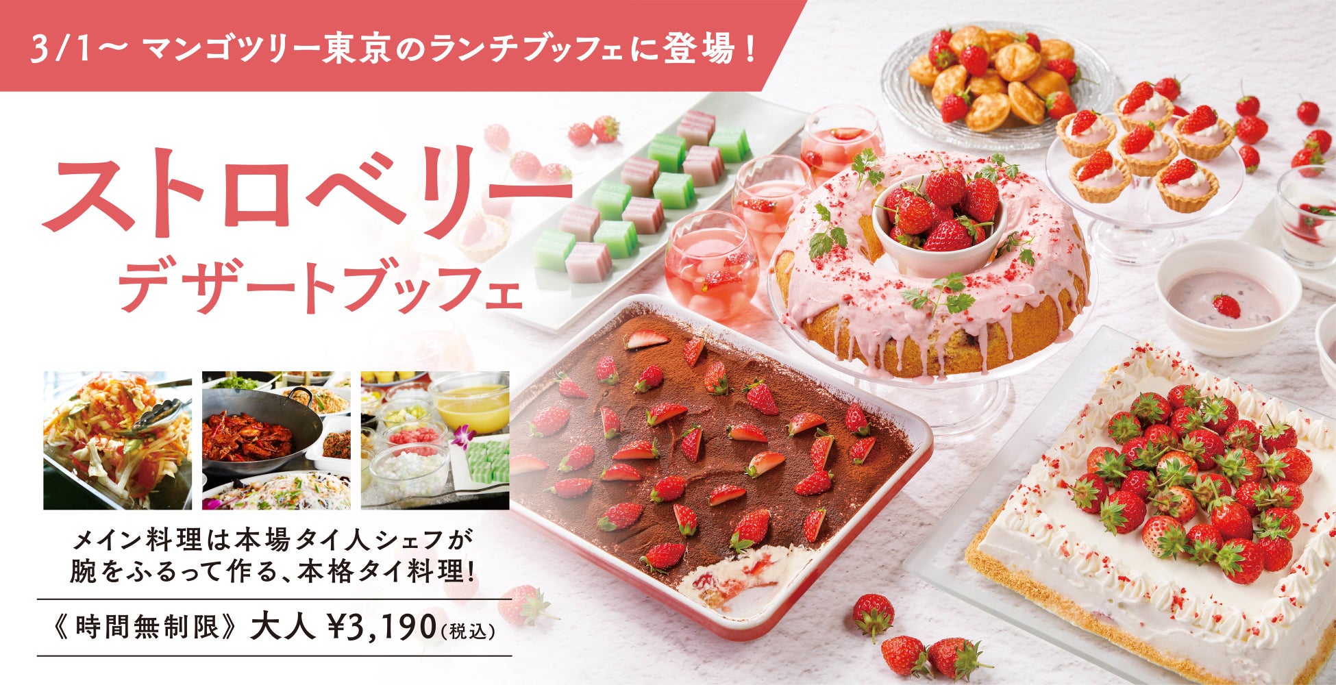 アークランドサービスホールディングス株式会社の子会社、海外の本場の味を日本で展開する株式会社ミールワークス(本社:東京都千代田区、代表取締役社長:小島 一生)の、タイ・バンコクに本店を持ち、ロンドン、東京、⾹港と世界に広がるタイ料理レストラン「マンゴツリー東京」では、2022年3⽉1⽇(火)から4月30日(土)まで、⼤⼈気のランチブッフェで、いちごデザートをお好きなだけお召し上がりいただける「ストロベリーデザートブッフェ」を開催いたします。