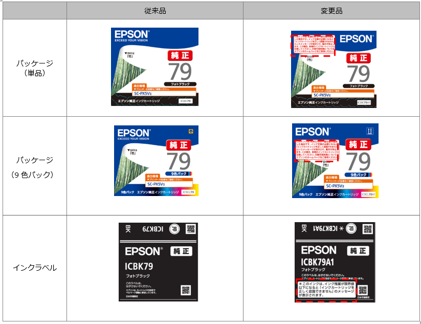 インクカートリッジのパッケージおよびインクラベルも以下の通り型番変更や注意事項が記載されます。