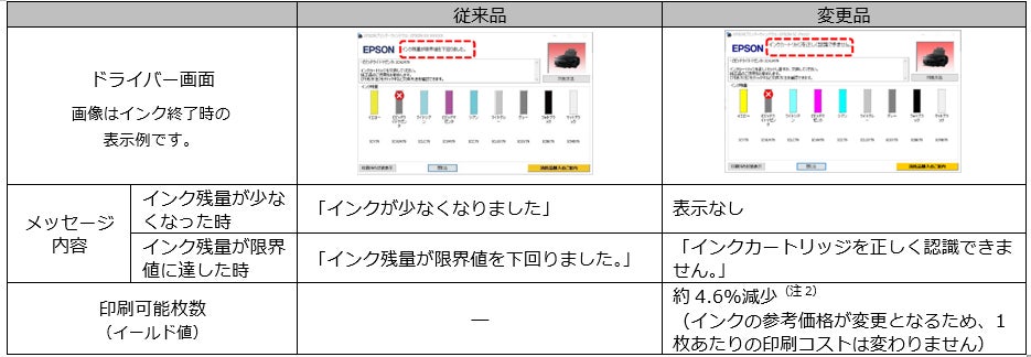 今回、変更品は従来品からドライバー画面のインク残量に関するメッセージ内容が変更となり、また印刷可能枚数が減少しますが、インクの参考価格を変更するため、1枚あたりの印刷コストは変わりません。詳しくは下部「2.仕様変更内容」をご参照ください。