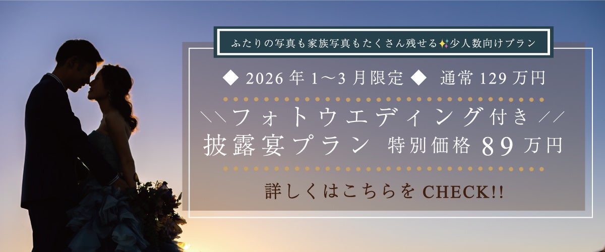 2026年1月〜3月の期間限定で、家族婚やマタニティウエディングにもぴったりな【フォトウエディング付き披露宴プラン(15名89万円)】
