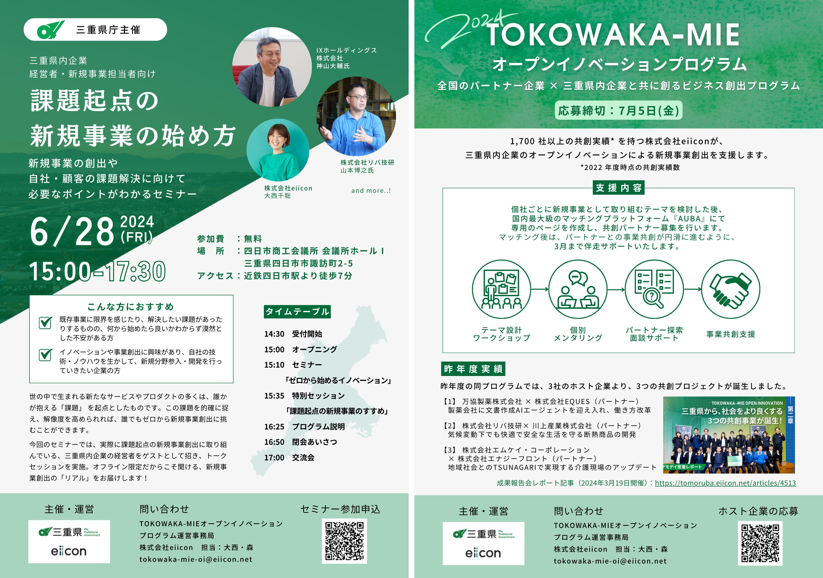 eiiconは、三重県による本事業ならびに本プログラムの企画・設計・運用からPR戦略まで運用全般を強力にサポートし、三重県内企業と全国スタートアップとの共創を今年度も加速させてまいります。