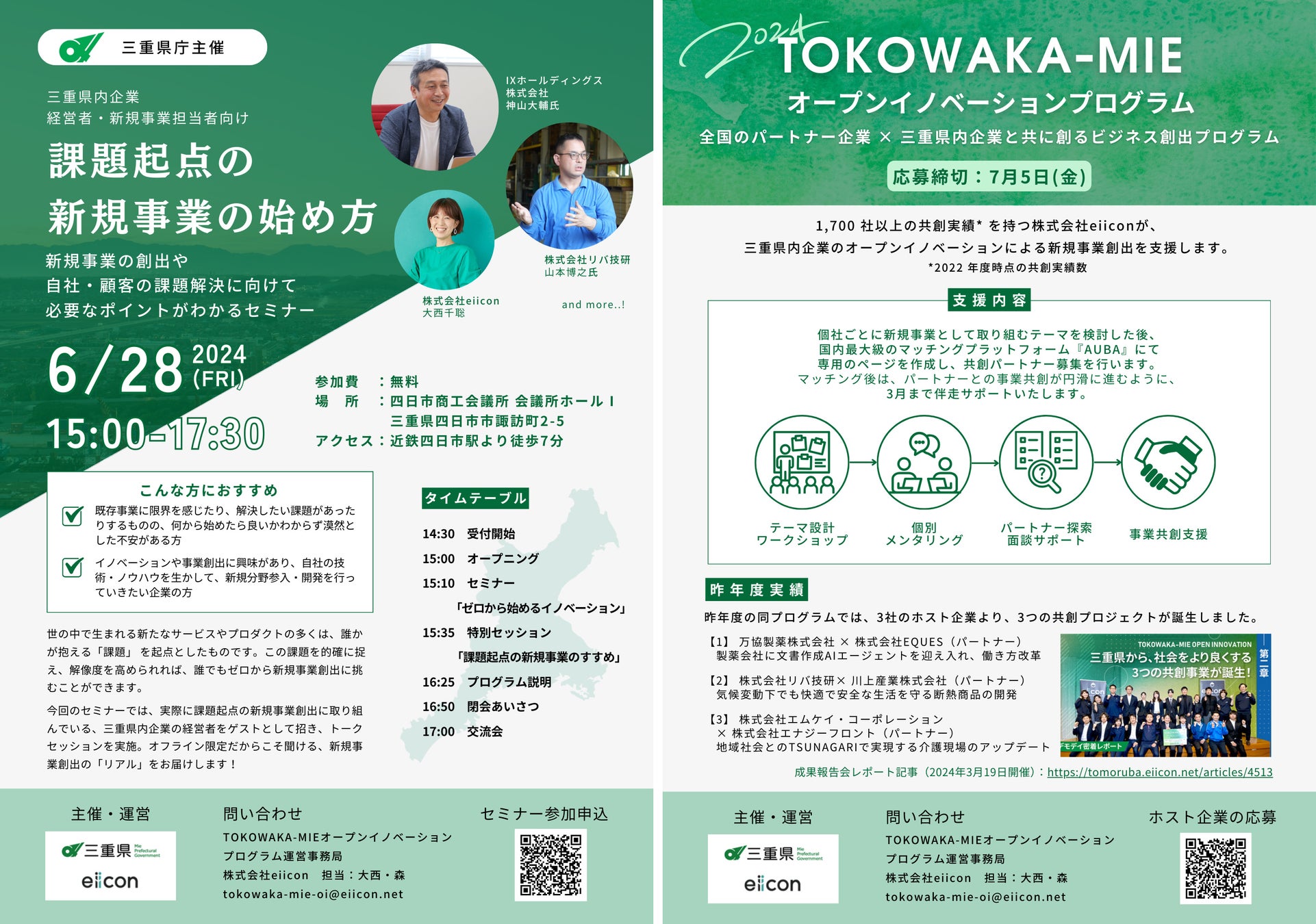 【三重県 × eiicon】TOKOWAKA-MIE オープンイノベーション推進事業 3期目始動!6月28日(金)開催 三重県内企業向け新規事業創出セミナー 参加者募集
