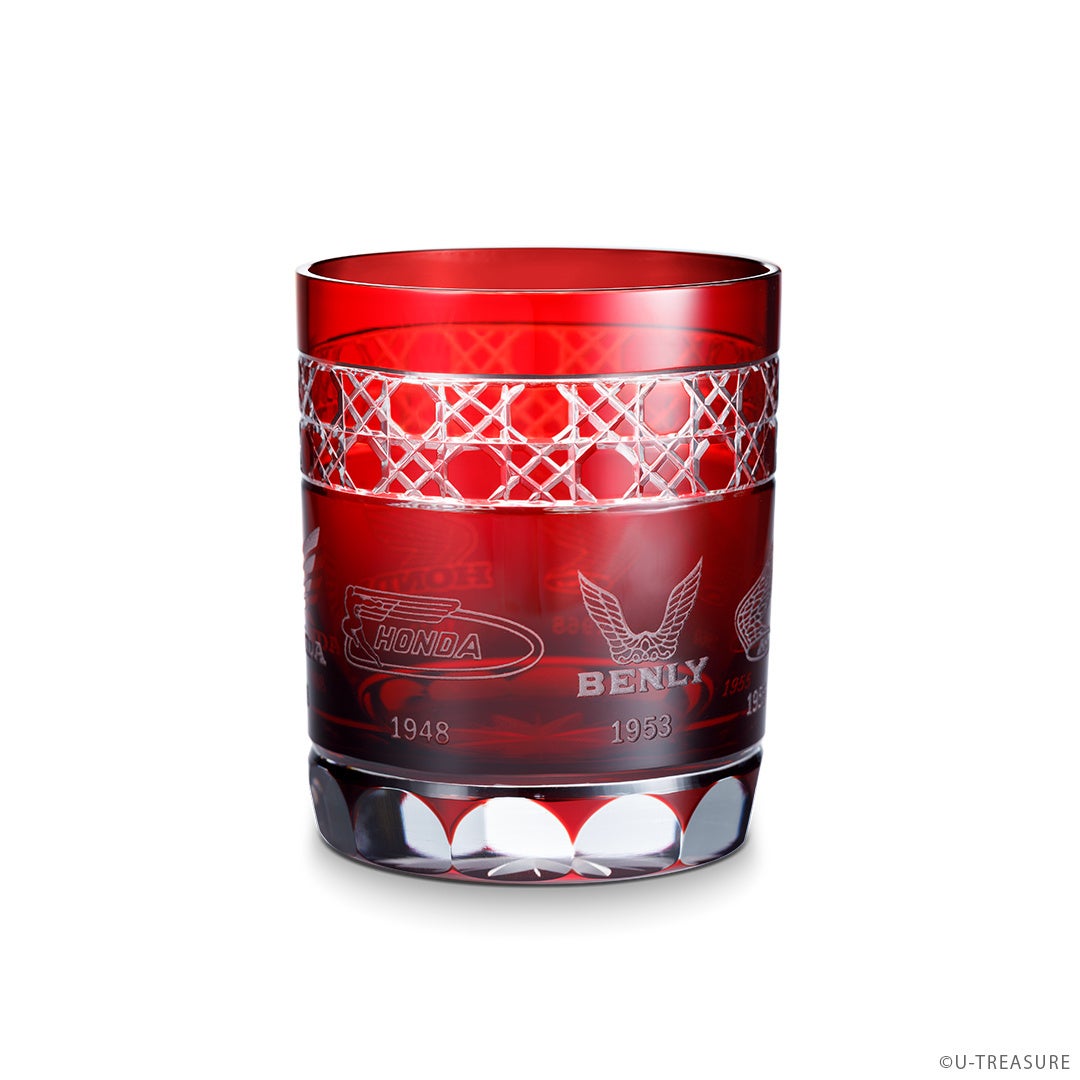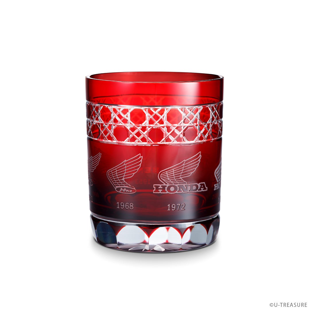 赤色の江戸硝子にHondaの二輪車にあしらわれている歴代の「Wing マーク」7種類をデザインした特別な逸品。