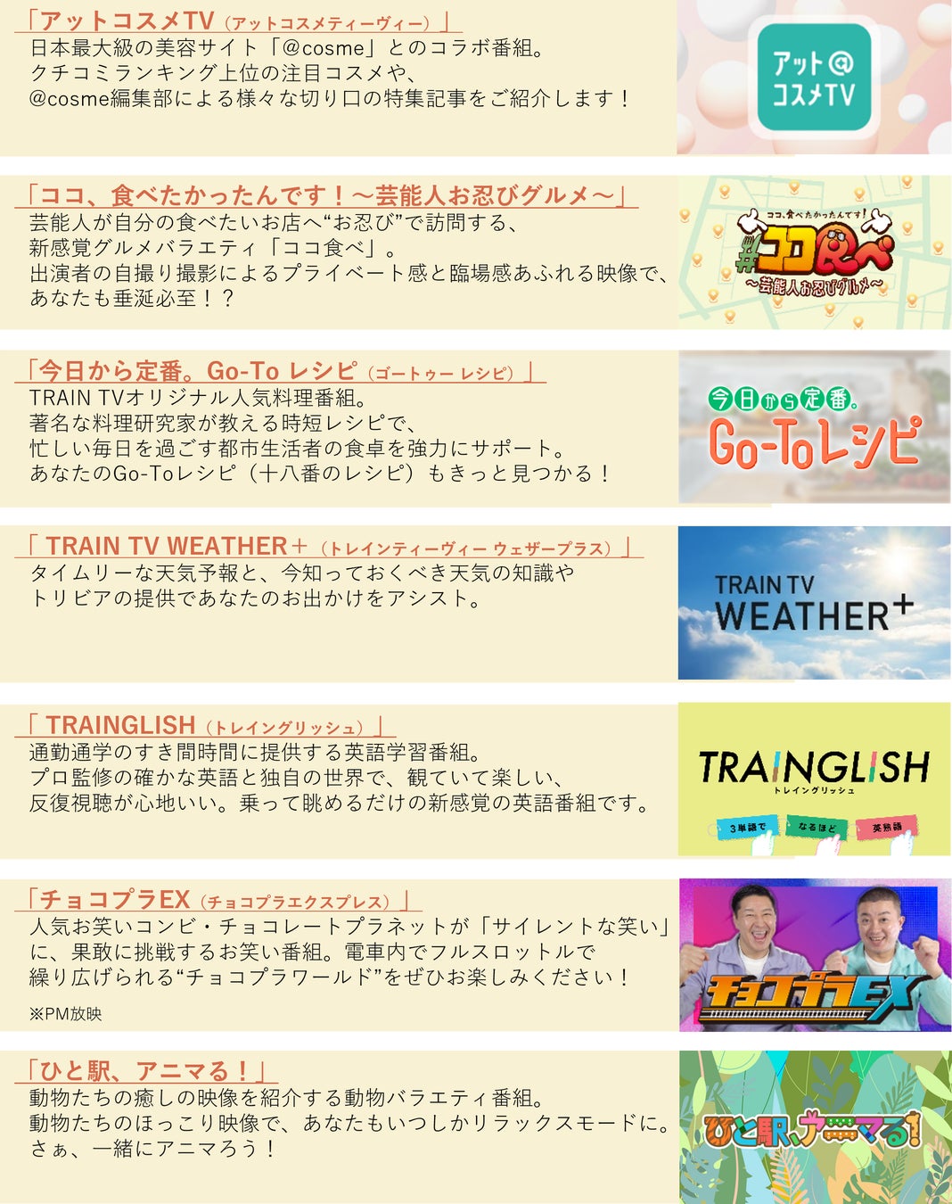 ※TRAIN TVは無音、番組尺は60秒(一部番組除く)