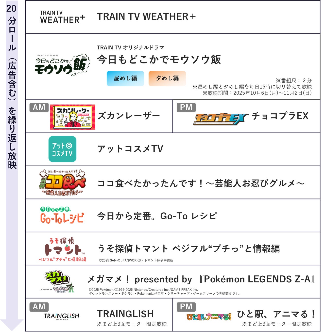 ※上記番組と広告(CM)で構成される20分ロールを、始発~終電まで繰り返し放映(毎週月曜更新)