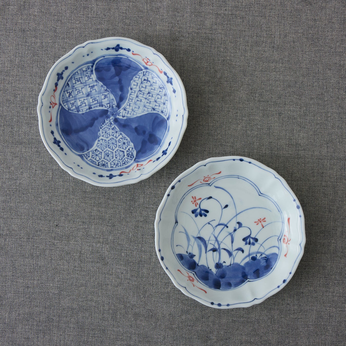 花のように波打つ縁を持つプレートで、幸福や繁栄を象徴する高麗草花や梅祥瑞の縁起柄と赤絵のポイントが食卓を華やかに彩り、縁が立ち上がった使いやすい形状で取り皿として毎日の食卓にぴったりなサイズです。