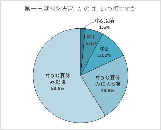 高校受験では、内申点と試験の合計点で合否判定を行うことや、内申点が出願条件であるなど、内申点が影響する場合が多い。また、模試の結果を参考に志望校選びを行う受験生も少なくない。そのため、内申点や模試の結果が出る中学3年生の夏休み以降に、第一志望校を決める受験生が多いと考えられる。