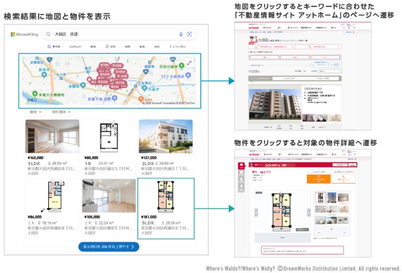 住まいを探すユーザーが「Microsoft Bing」で、住みたい街や不動産に関するキーワードで検索した際に、検索結果にて物件情報や地図を確認することができます。例えば「大田区 賃貸」で検索すると、大田区の地図と物件情報の一部が表示されます。表示された地図をクリックすると「不動産情報サイト アットホーム」の大田区の賃貸居住用物件一覧ページへ遷移します。また、気になる物件を選択すると、「不動産情報サイト アットホーム」の物件詳細ページへ遷移します。(対象種目:賃貸居住用物件、売買居住用物件)