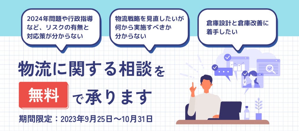 「上がり続けるコストへの対策に不安を感じている」「物流体制を見直したいが、どこにリスクや改善余地があるかわからない」など、お悩みの荷主企業(製造業・卸売業・小売業)を対象に、無料個別相談会を、2023年10月末までの期間限定で実施しています。