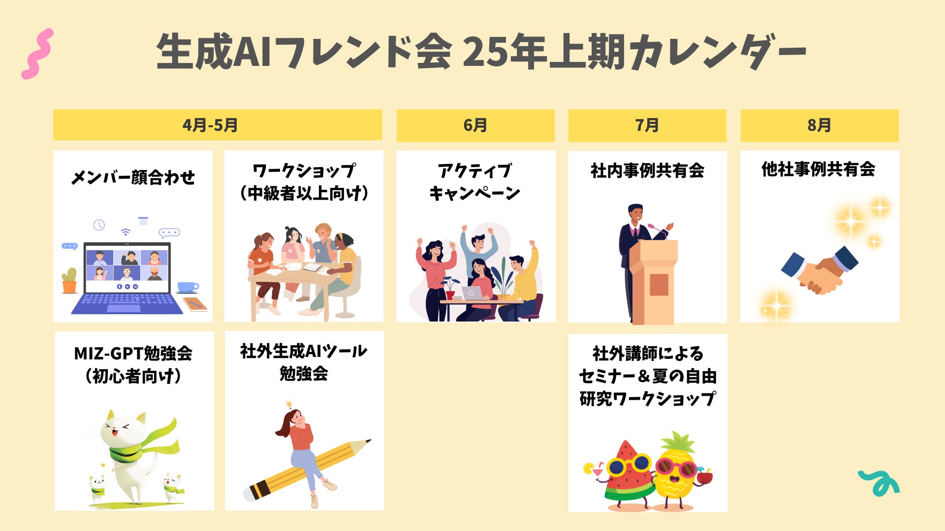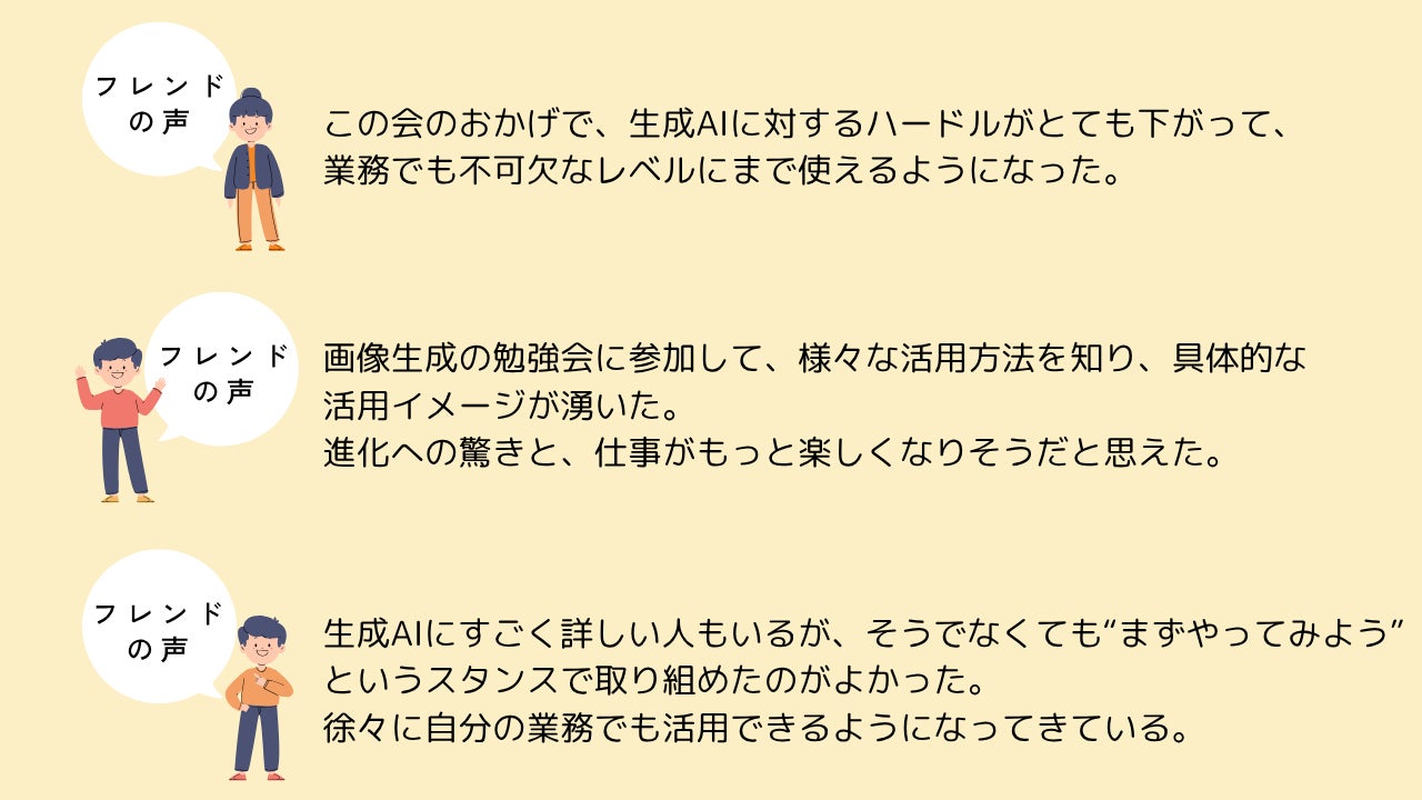 この想いから、生成AI活用に前向きな社員が、経験や工夫、失敗も含めてリアルな情報を気軽に共有できる場を目指して、フレンド会を立ち上げました。