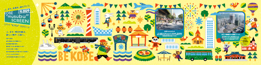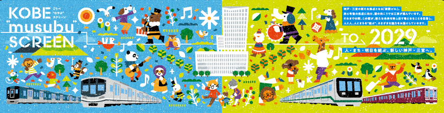 「街の結節点機能」として新しく完成する新駅ビルを中心とした神戸の街に、人に見たてたかわいい動物が集まり、にぎやかに楽しく過ごす様子をポップなイラストで描き、今後街が変わることへのワクワク感を込めた“明るく前向きな空間”を表現します。