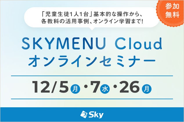実際の授業を想定した活用シーンに合わせて「SKYMENU Cloud」の操作をご体験いただけるセミナーです。操作方法や活用場面などに関するご質問も承りますので、ぜひお気軽に「SKYMENU Cloud」をご体験ください。