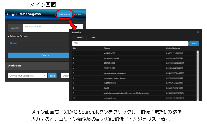 本新機能は、ユーザである創薬研究者が検索フォームに、着目する遺伝子や疾患を入力すると、AI「KIBIT」がPubMed*²に掲載されている3000万報以上の論文情報を即時に解析し、入力ワードに対するコサイン類似度の高い順に遺伝子や疾患をリストアップするものです。コサイン類似度は、分布仮説*³に基づく独自の自然言語処理技術(日本:特許第6346367号、米国:特許第11544309号)により算出するため、PubMedの論文からは直接的な報告がない、もしくは数報のみの報告に限られるケースにおいてもリストに含まれます。すなわち、KIBIT Amanogawaの網羅的・客観的な解析により新規性が極めて高い遺伝子・疾患もリストアップが可能になります。これにより、着目する遺伝子や疾患に関連する標的遺伝子・疾患の発見が大幅に効率化・早期化され、新規性が高い遺伝子など予想外の遺伝子や疾患に導くことも可能となり、飛躍的に網羅性が向上すると考えております。