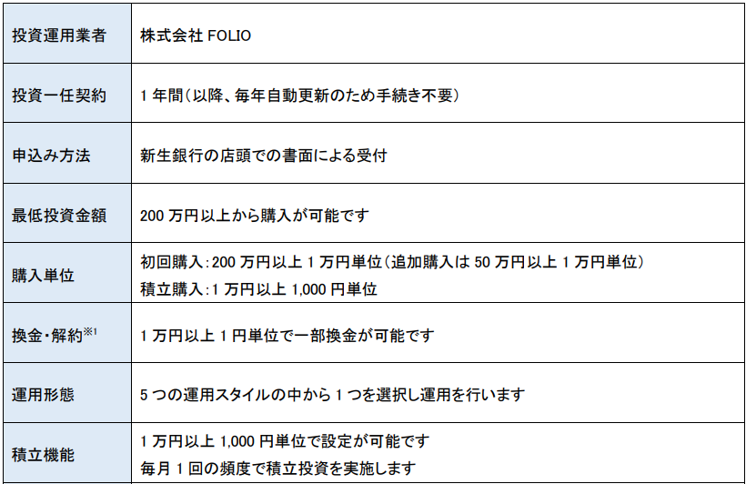 ●新生銀行が提供するファンドラップ(SBIラップ×新生銀行)は、金融商品仲介口座を通じてお客さまと株式会社FOLIO(以下「FOLIO」といいます)との間で締結する投資一任契約の締結を媒介するもの(以下「本サービス」といいます)であり、資産の運用はFOLIOが行います。また、本サービスの利用に際してお客さまは、株式会社SBI証券(以下「SBI証券」といいます)に金融商品仲介口座を開設いただく必要があり、SBI証券が「SBIラップ×新生銀行」に関する資産の管理を行います。