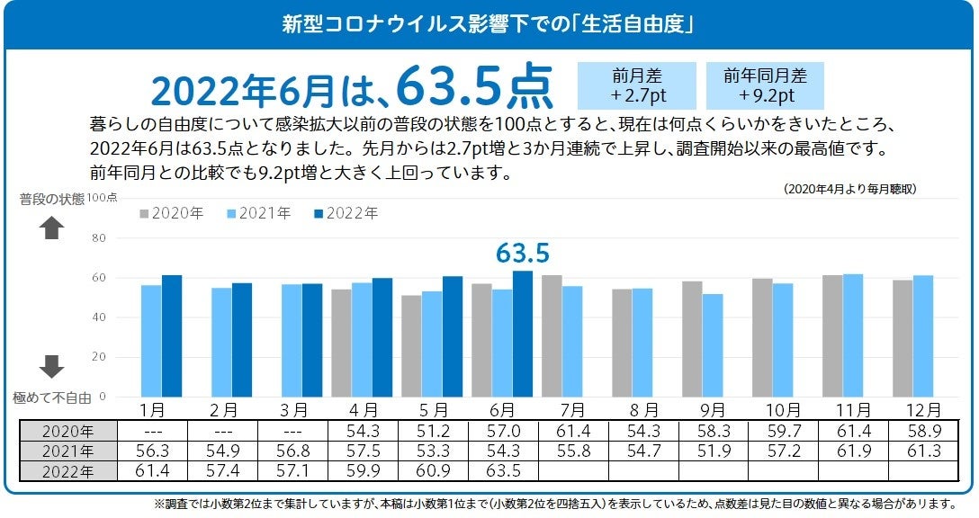 | 6月の「生活自由度」は調査開始以来の最高値、63.5点に。 「行動の抑制」が引き続き緩む |