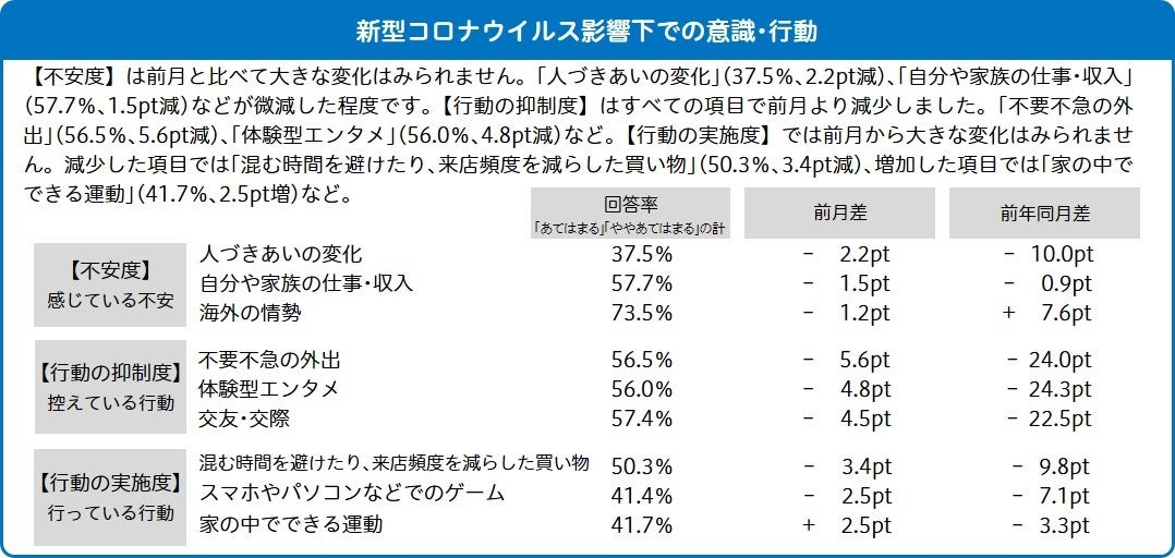 【調査前の状況】3年ぶりに緊急事態宣言やまん延防止等重点措置などの行動制限がないゴールデンウィークが終了。全国の新規感染者数は、連休明けにやや増加傾向を見せたものの、5月中旬から再び減少に転じ、そのまま月末まで減少が続きました。5月20日には厚生労働省がマスクを外してもよい場合を例示した「マスク着用の考え方」を発表。6月からは海外からの入国者数制限を緩める方針も発表されました。感染状況が落ち着きを見せ、人流も社会経済活動も活発化の機運が高まる中での調査です。