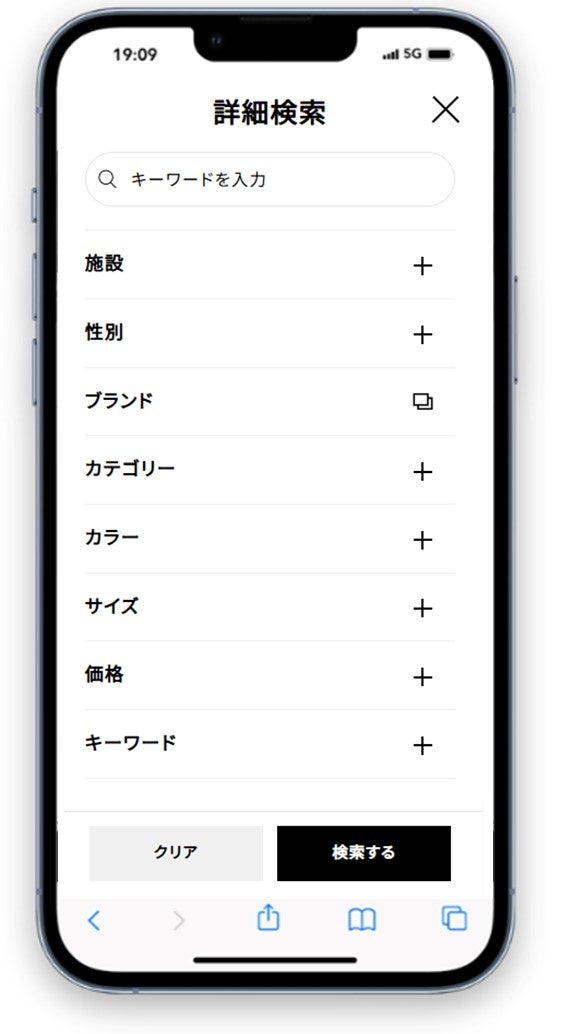 取り扱い施設、ブランド名、商品カテゴリー、カラー、サイズ、価格帯など8項目での絞り込みとキーワード検索を実装。
