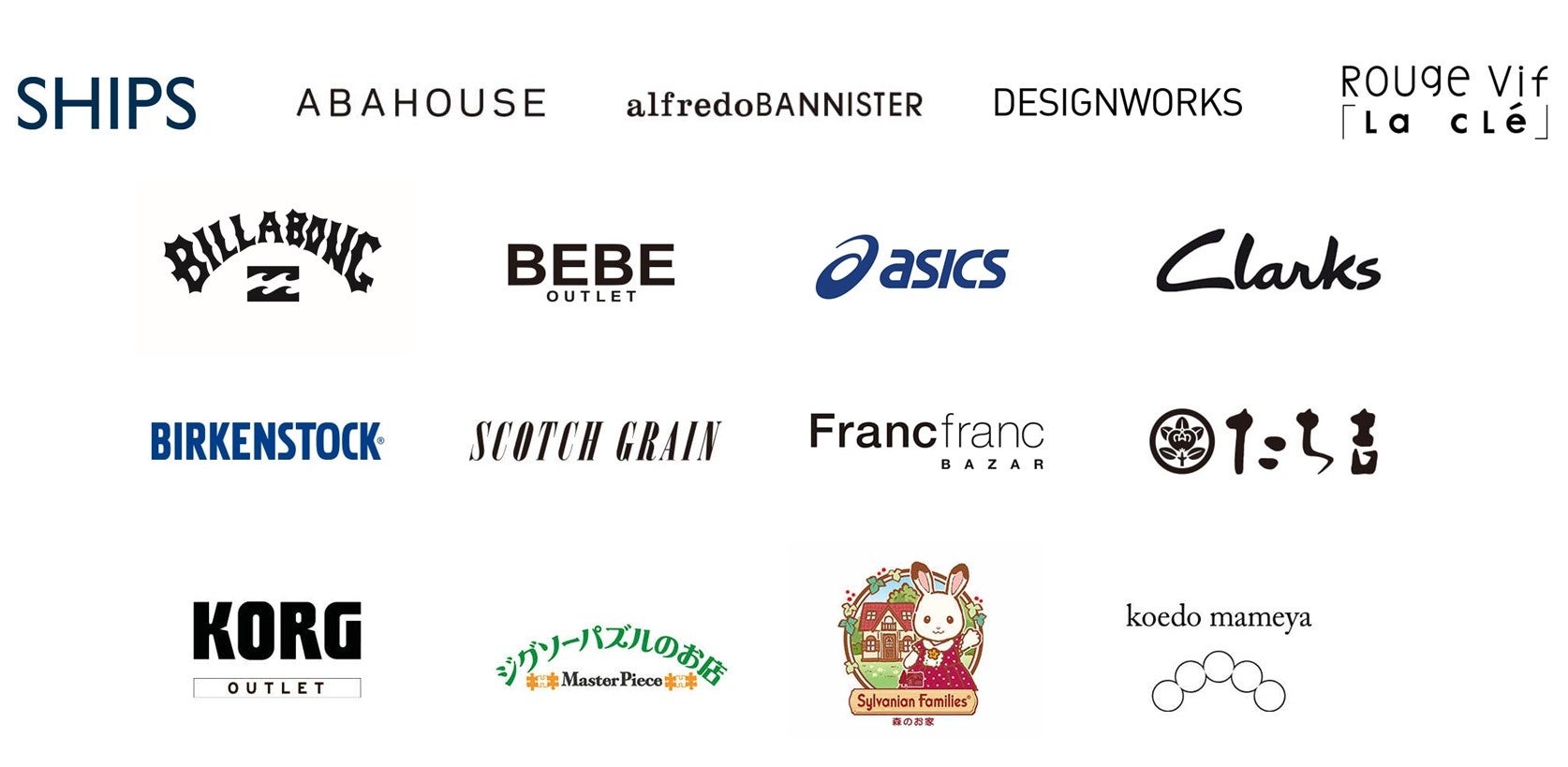 Ships、Abahouse、Alfredobannister、Designworks、Rouge Vif La Cle、Billabong、Be Be、Asics、Clarks、Birkenstock、Scotch Grain、Francfranc、たち吉、Korg、