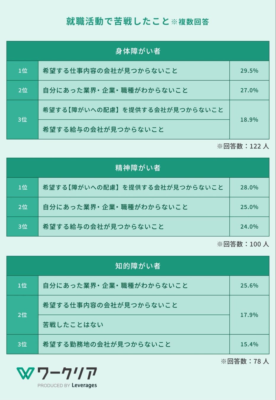 精神障がい者が就活で苦戦したことの1位は、希望する【障がいへの配慮】を提供する会社が見つからないこと