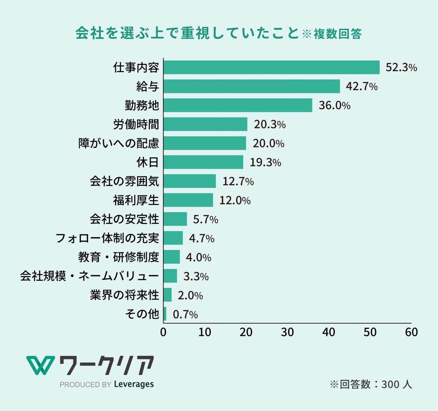 障がい者が会社を選ぶ上で重視することの1位は「仕事内容(52.3%)」となり、約半数が重視すると回答しました。これは、「給与(42.7%)」や「労働時間(20.3%)」「障がいへの配慮(20.0%)」を抑え、最も多い回答となりました。