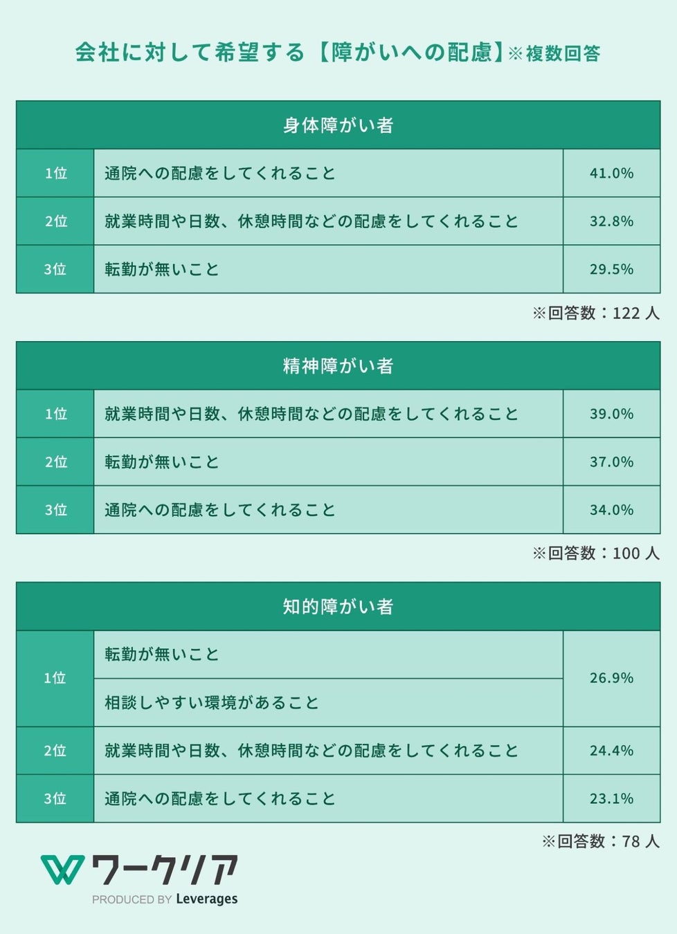 精神障がい者が、会社に対して希望する【障がいへの配慮】で最も多かったのは「就業時間や日数、休憩時間などの配慮をしてくれること(39.0%)」となりました。