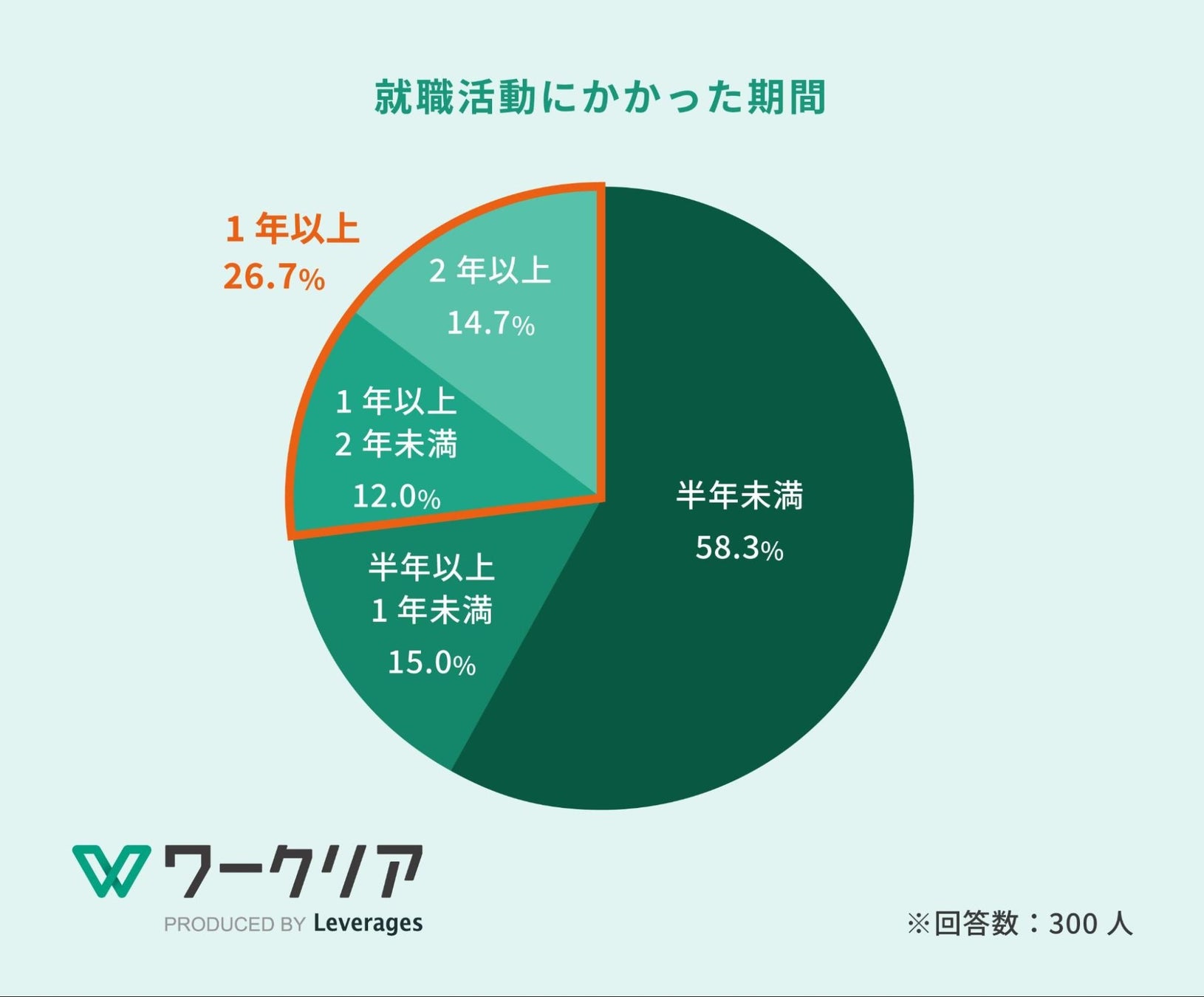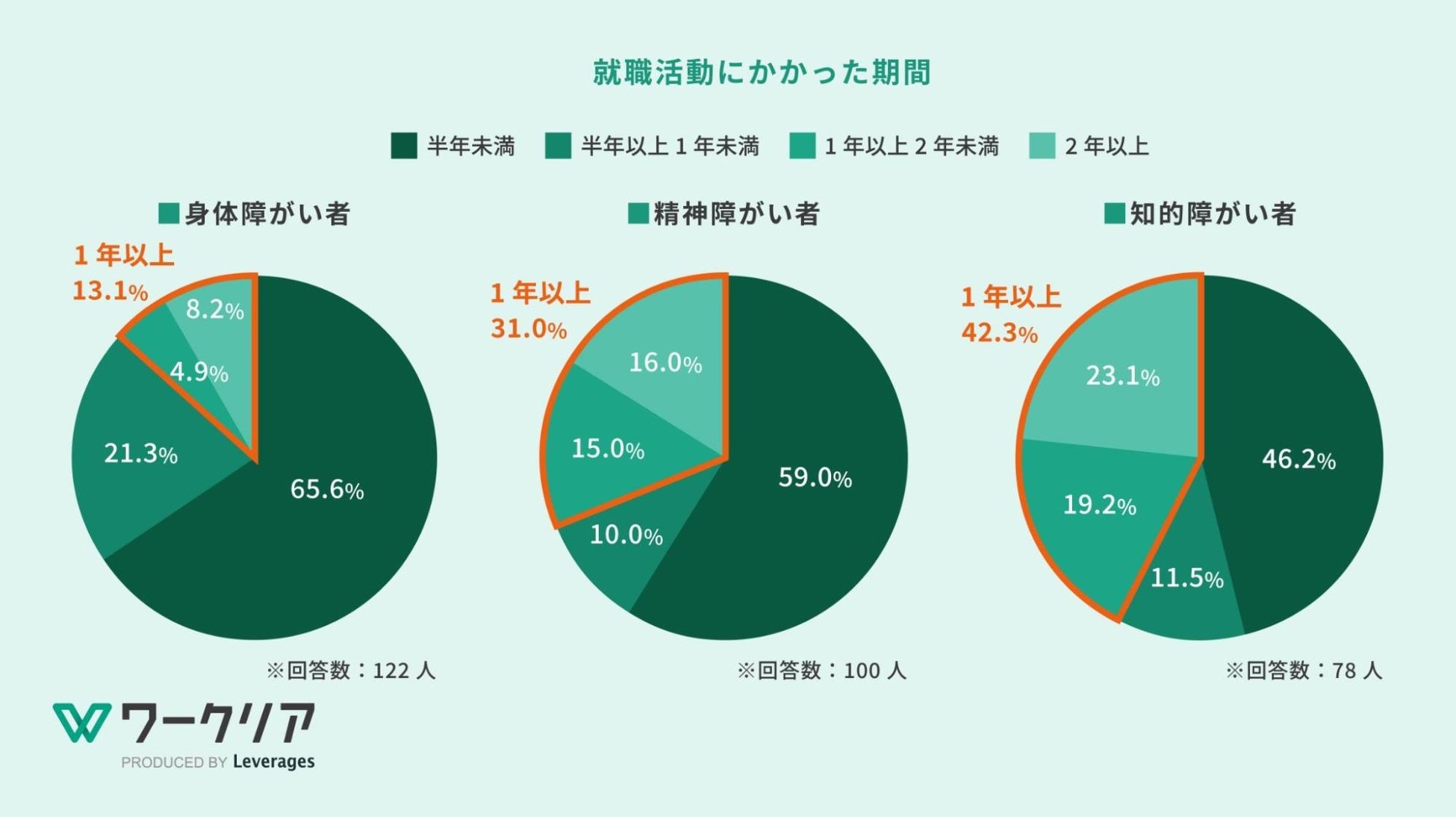 約3割の障がい者が、初めて行う就職活動に「1年以上(26.7%)」の期間をかけていることがわかりました。障がい者手帳の種類ごとでは、就活期間が「1年以上」と回答した身体障がい者は1割程度だったのに対し、「精神障がい者(31%)」「知的障がい者(42.3%)」と約3倍の結果となりました。精神障がい者と知的障がい者は身体障がい者と比べて、就職活動が長期化する傾向が見受けられます。