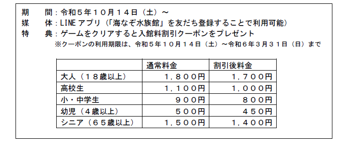 「海なぞ水族館」は、「LINE」の友だち登録をすると遊ぶことができる、無料の謎解きゲームです。スマートフォンがあれば、いつでもどこでも謎解きを楽しむことができます。全ての謎をクリアすると、『うみがたり』の入館割引クーポンをプレゼントします。