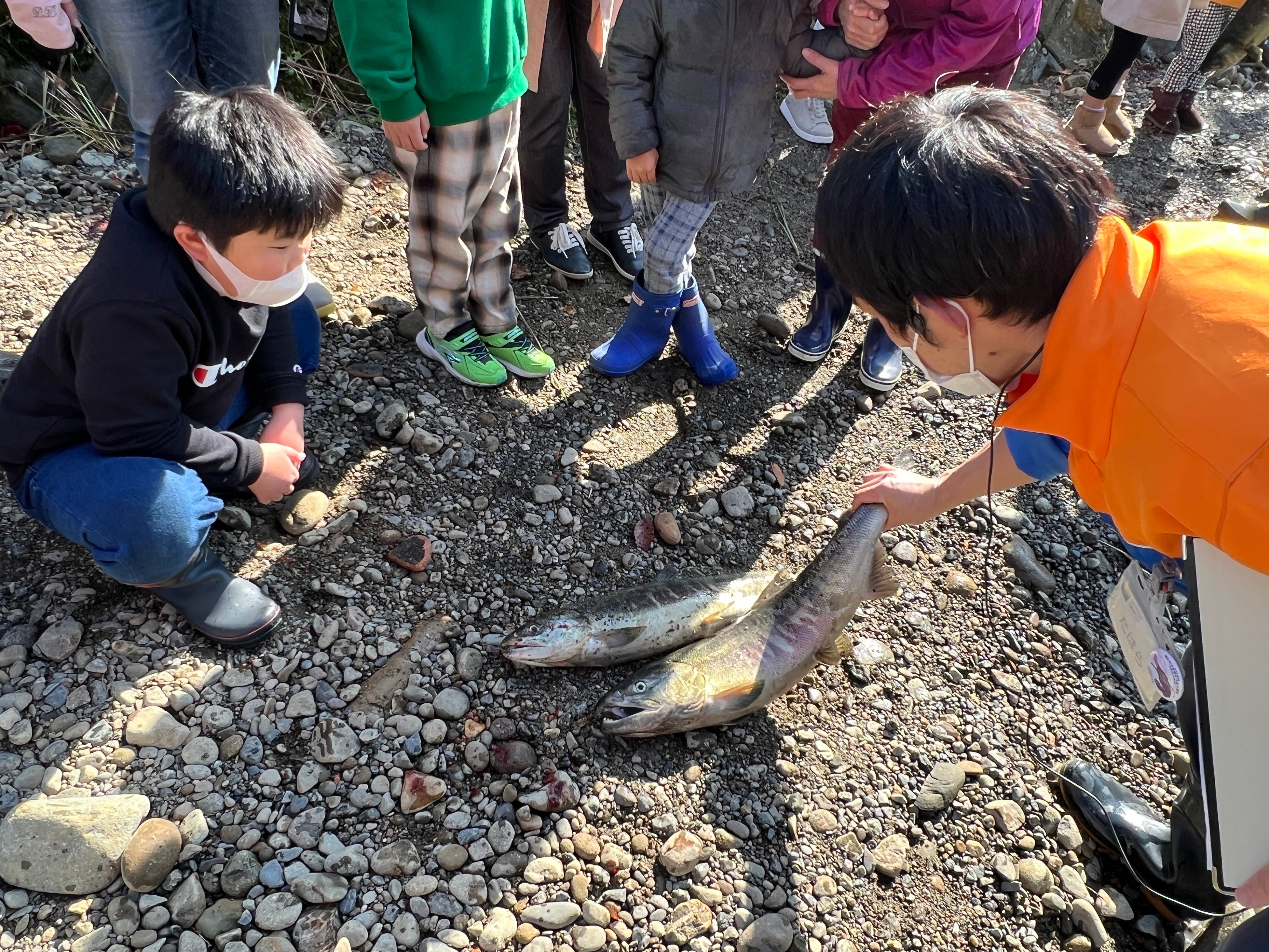 飼育スタッフと一緒にサケの遡上観察