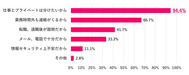 「よくなかった派」の人にSNSを教えてよくなかったと思う理由を尋ねたところ、ほとんどの人が「仕事とプライベートは分けたいから」と回答しました。「業務時間外も連絡がくるから」66.7%、「転職、退職後が面倒だから」41.7%など、仕事以外の場面で関わりを持ちたくないと考える人はSNSを教えたことによるデメリットを感じやすい状況が伺えました。