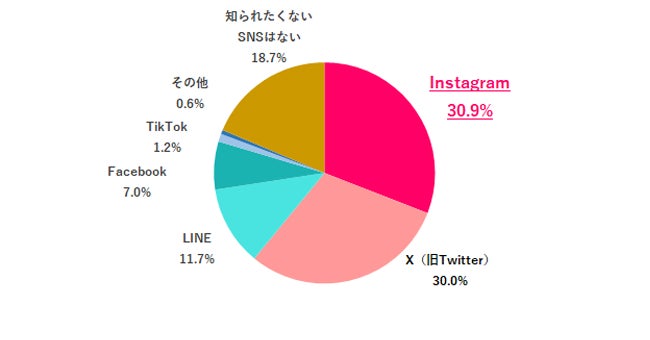 職場の人に一番知られたくないプライベート用のSNSを尋ねると、「Instagram」30.9%、「X(旧Twitter)」30.0%でした。投稿型のSNSなので、プライベートな投稿内容を知られたくないと思う人が多いのではと考えられます。一方で「LINE」はクローズドな会話の用途で使うことが多いため、抵抗がない人が多いのではと推察されます。「知られたくないSNSはない」と回答した人も18.7%いました。