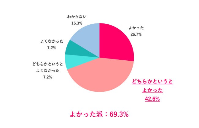 「どちらかというとよくなかった」7.2%、「よくなかった」7.2%を合わせた「よくなかった派」は14.4%でした。「よくなかった派」を年代別で見ると、20代が19.4%、30代が10.9%、40代が13.6%となり、20代が他の年代よりも多い傾向がみえました。