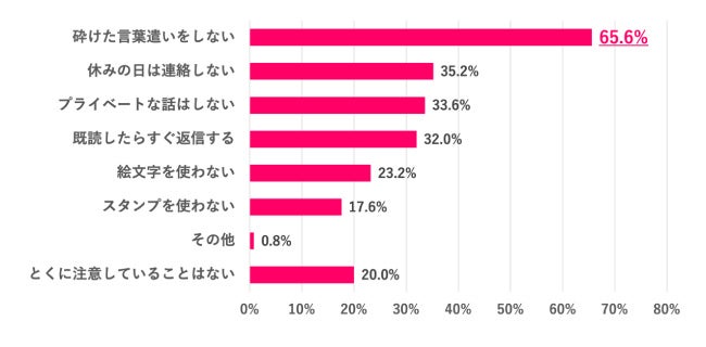 上司にプライベート用のSNSを教えている人に、上司とのやりとりで注意していることを聞いたところ、「砕けた言葉遣いをしない」が65.6%で1位となりました。気軽にコミュニケーションがとれるSNSだからこそ、失礼のないように心がけている様子が伺えます。次いで多かったのは「休みの日は連絡しない」35.2%、「プライベートな話はしない」33.6%などで、仕事とプライベートをしっかり分けることを意識している人が多いことがわかりました。
