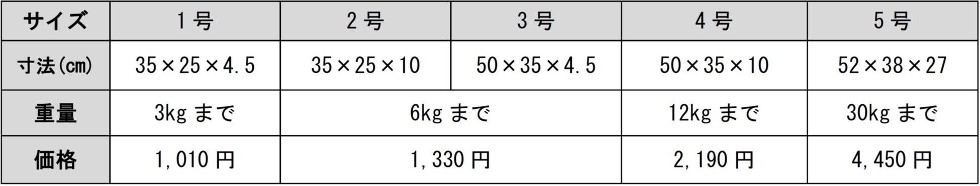 上記の表の寸法と重量のいずれか大きい方のサイズを適用します。