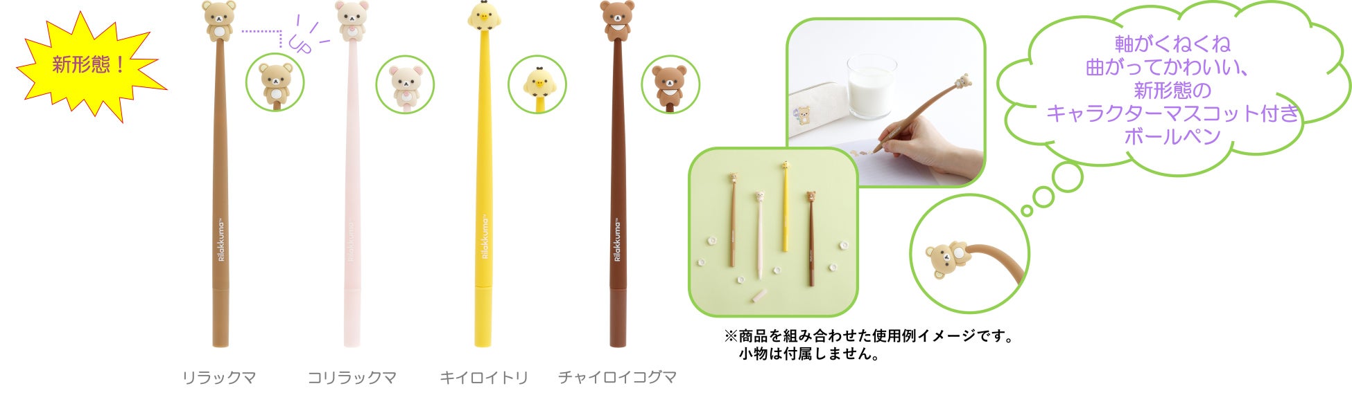 ・くねくねボールペン(各1,100円※税込):シリコーン製軸・PVC製マスコット付