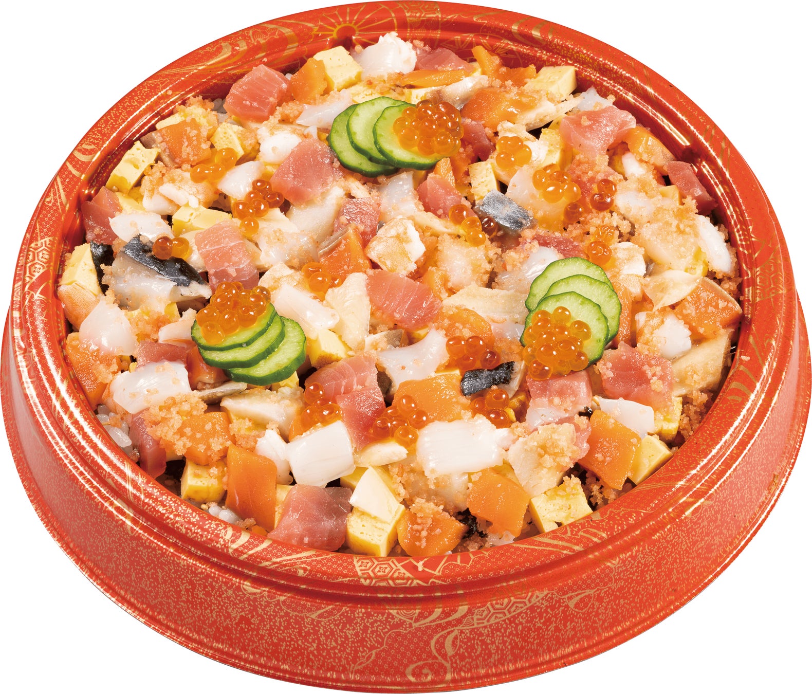7種類の海鮮を含む12種類の具材を使用した、可憐な盛り付けで目にもお腹にも嬉しい一品。長寿を意味する「えび」や、財宝が貯まることを意味する「たまご」などの縁起の良い食材をはじめ、「まぐろ」や「サーモン」など大人からお子さまに人気のネタを贅沢に散りばめました。