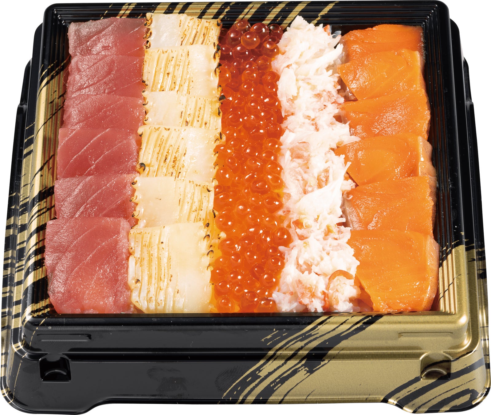 具材:いくら・まぐろ・サーモン・真いか・えび・とろ〆さば・煮穴子・玉子・えびおぼろ・きゅうり・海苔・いり胡麻
