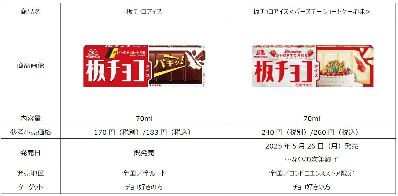 2025年に30周年を迎えるにあたり、日頃ご愛顧いただいている皆様に感謝の気持ちをお伝えしたいと考え、記念商品の発売を企画しました。「板チョコアイス<バースデーショートケーキ味>」は、クッキークランチが入ったザクザク食感の分厚いホワイトチョコと、本物の苺の種のつぶつぶが入った甘酸っぱい苺ソース、ホイップクリーム風味アイスを組み合わせ、板チョコアイスならではのショートケーキの味わいに仕立てました。また、発売前に「板チョコアイス<バースデーショートケーキ味>」を抽選で100名様にお届けする先行プレゼントキャンペーンを3月28日(金)から開始します。さらに、1995年の発売当時に制作された「板チョコアイス誕生秘話漫画」をブランドサイトで公開します。