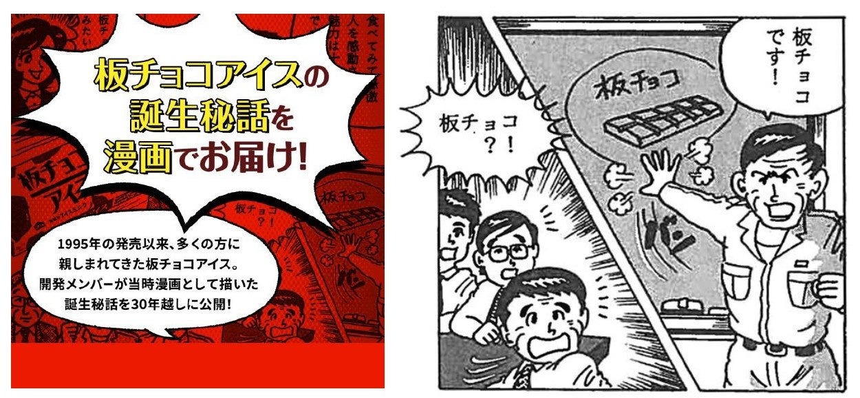 1995年の発売当時に制作された「板チョコアイス誕生秘話漫画」をブランドサイト(https://www.morinaga.co.jp/itachoco/)で公開します。この漫画は30年前に、森永製菓社員によって描かれ、商談資料として利用されていました。板チョコアイス誕生のきっかけを、30年越しに初めて一般公開します。