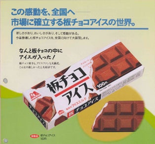 発売当時のアイスクリームのマーケティングテーマは「ジャンジャン、新ジャンル」。驚きや感動を提供する新ジャンルの商品の開発に挑戦していました。「板チョコアイス」は、チョコレートメーカーならではの技術とイメージを活かし、リアルな形態と品質にこだわって完成した、新しい形態・食感・味わいの商品でした。新ジャンルの商品だけに、ネーミングも分かりやすさにこだわり、「板チョコアイス」と命名されました。1995年春に東日本で発売したところ、たちまち大ヒットし、秋には全国発売になりました。