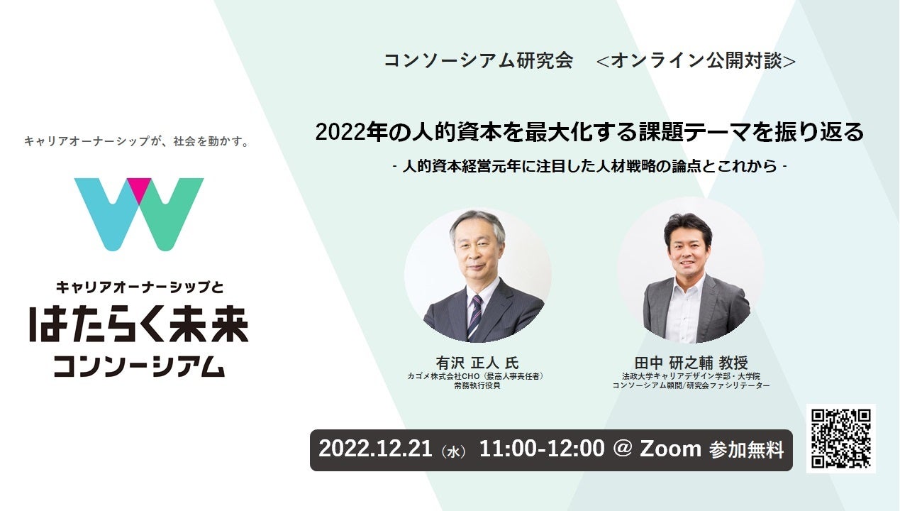 キャリアオーナーシップとはたらく未来コンソーシアム研究会、カゴメ有沢正人氏とタナケン先生によるオンライン公開対談 「2022年の人的資本を最大化する課題テーマを振り返る」開催のお知らせ