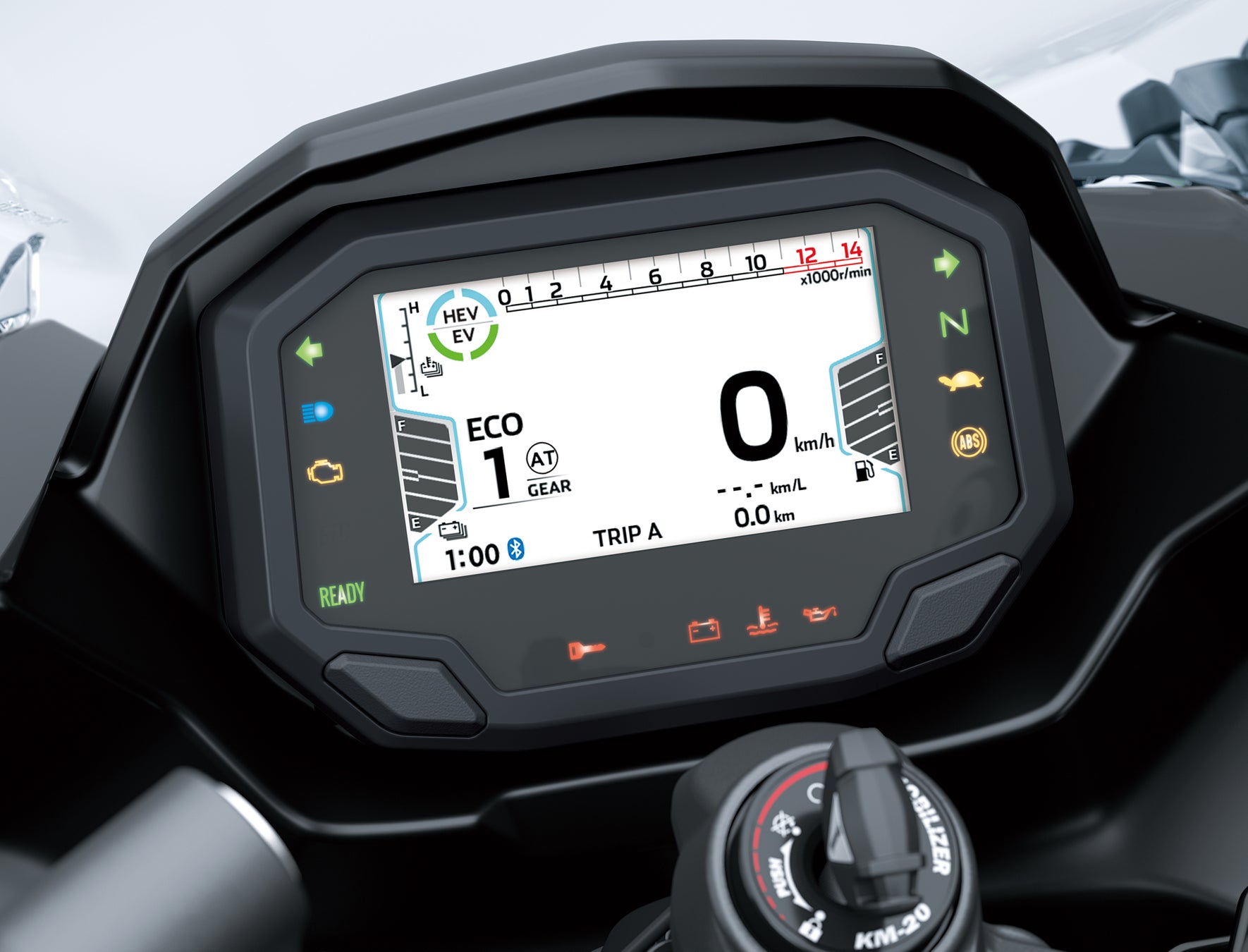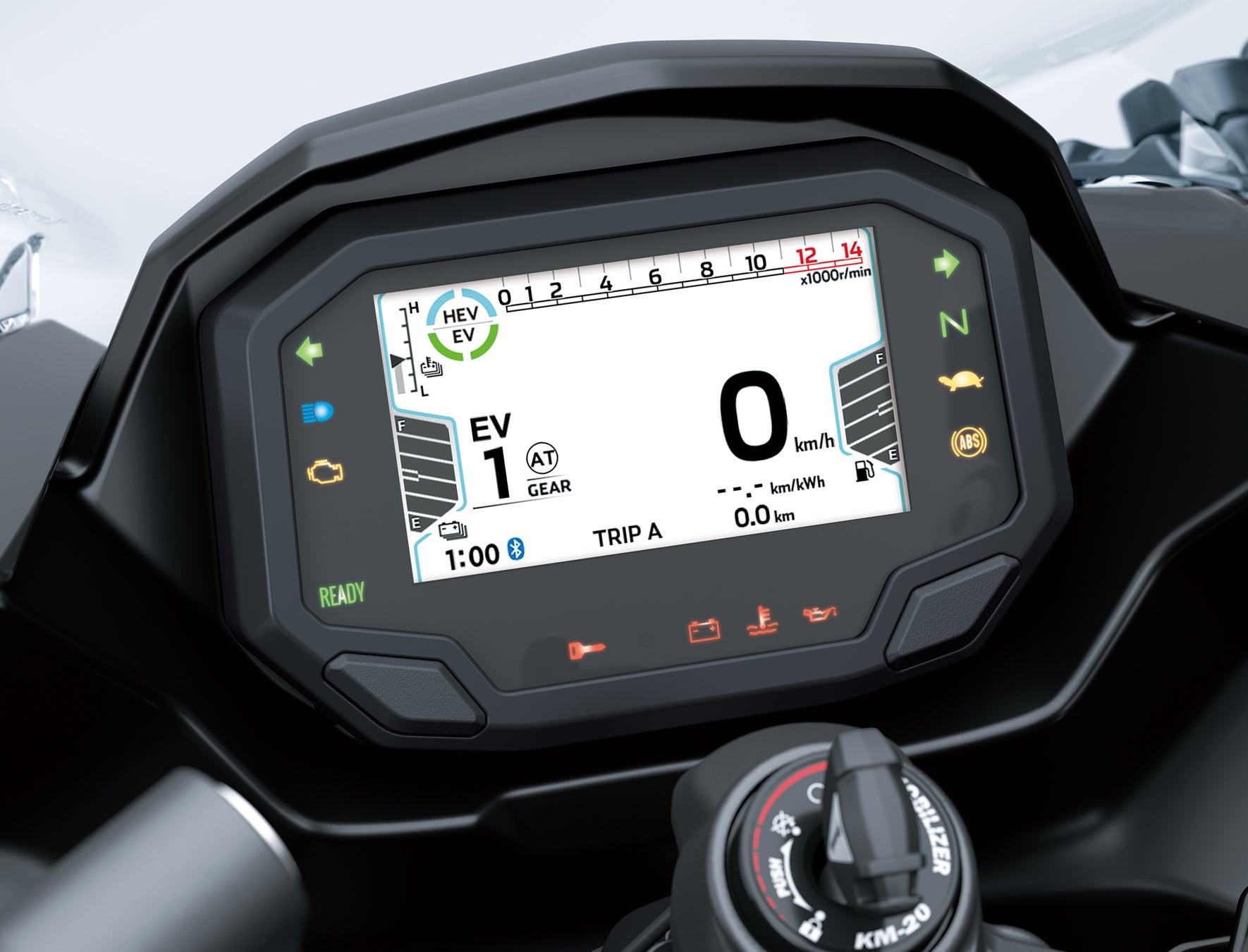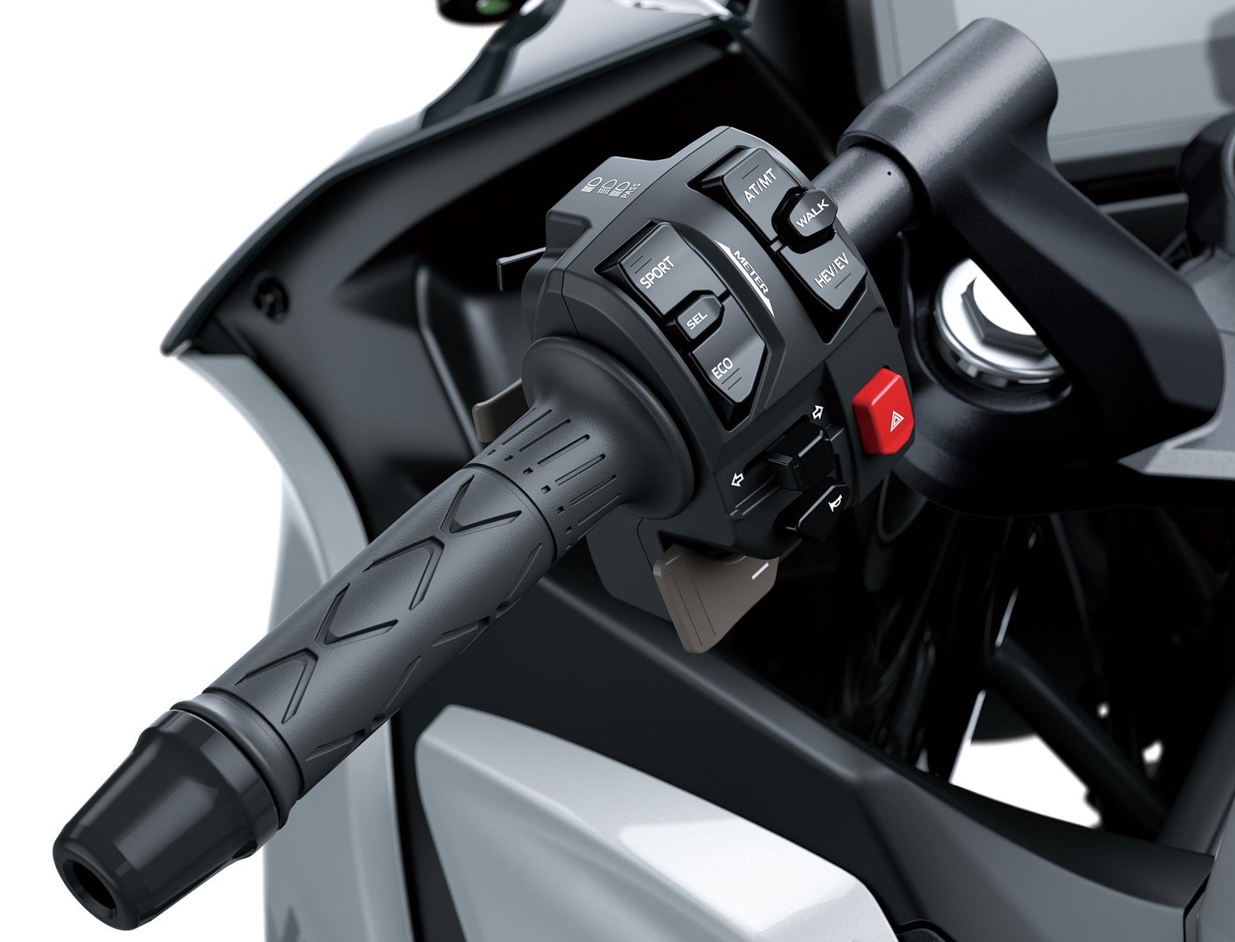 世界で初めて*のストロングハイブリッド**モーターサイクル、「Ninja 7 Hybrid」は数々の新たな感動をライダーに与えます。600ccクラスのサイズながら、「e-boost」を使えば瞬時に1,000ccクラスのスタートダッシュを見せる一方、燃料消費率は250ccクラスなみ。クラッチレバーレスの電子制御6速オートマチックは、左手元のシフトセレクタによるマニュアル操作により、ライダーの意思に忠実なスポーツ走行もこなすことが可能です。走行モードはエンジンとモーターの能力をフルに発揮する「SPORT-HYBRID」、モーターで発進し、必要に応じてエンジンが協調する「ECO-HYBRID」、静かでクリーンな低速用の「EV」の3つ。駐輪場での取り回しに便利なウォークモード(後進機能付き)も装備するなど、様々なテクノロジーが結集した「Ninja 7 Hybrid」は、これまでのモーターサイクルの概念を覆す、次世代のライディングを提供します。