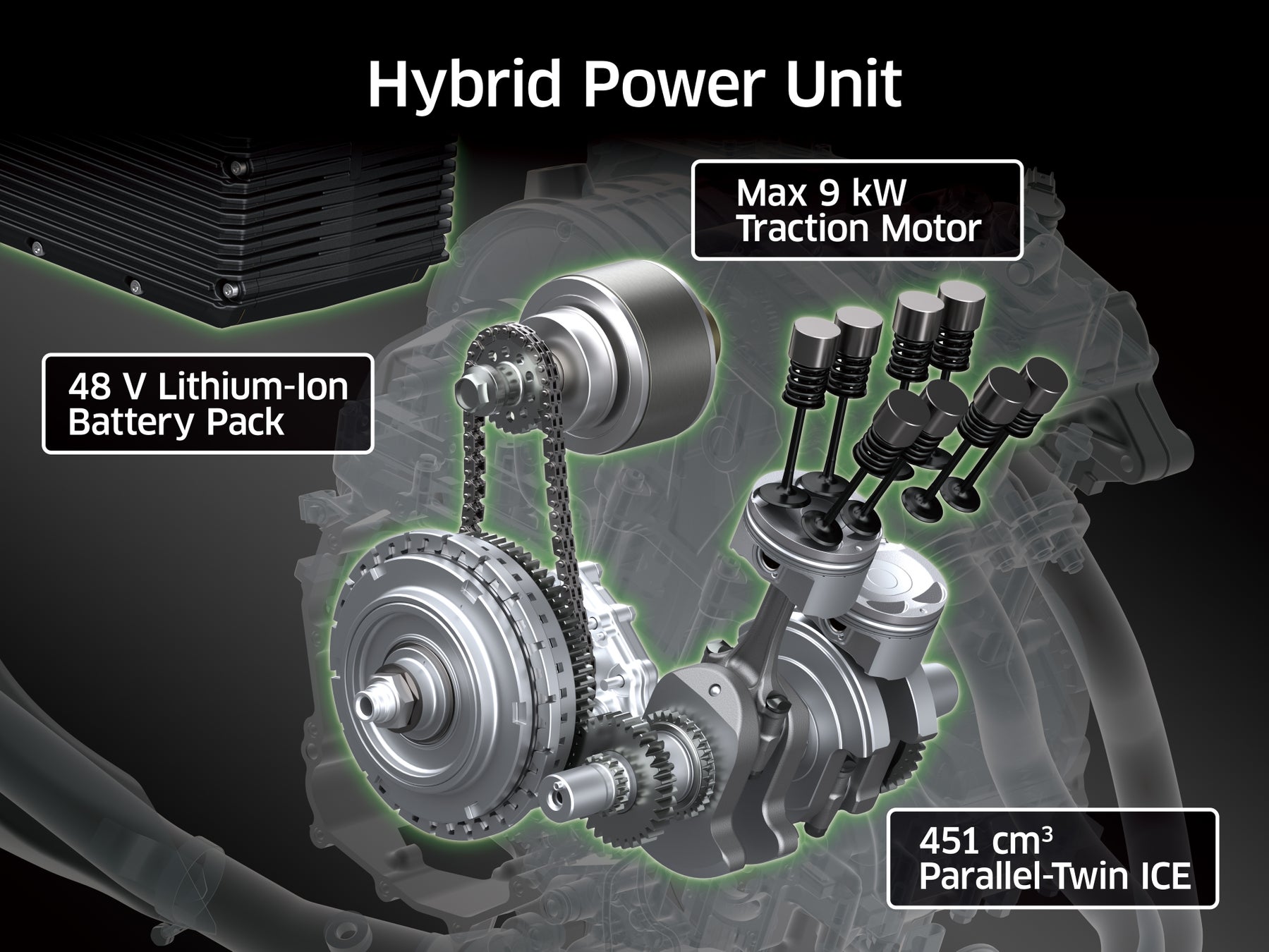 ・451㎝³水冷4ストローク並列2気筒ガソリンエンジンと交流同期モーターのコンビネーションがもたらす、次世代のパワーフィーリング