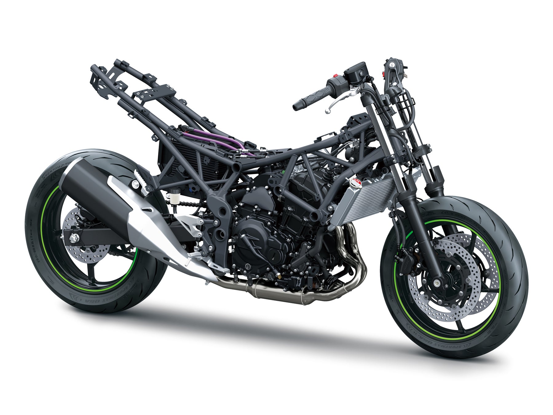 ・エンジン、モーター、大容量バッテリー、スターターゼネレーターなどの配置を吟味し、軽量なトレリスフレームに搭載することで実現した、カワサキスポーツモデルらしいハンドリング