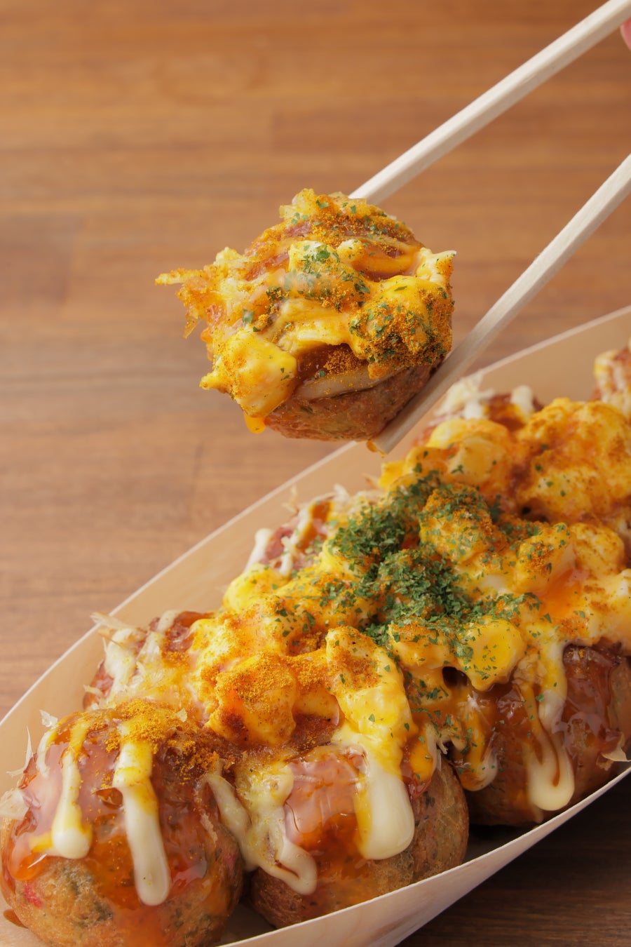 アツアツのたこ焼に、特製 「てりやきソース」 をかけ、コク深いパルメザンチーズ、とろけるモッツァレラチーズの2種を組み合わせた特製 「ミックスチーズ」 と店内仕込みの 「たまごサラダ」 をたっぷりトッピング。さらに、濃厚な 「卵黄ソース」 を追いがけし、仕上げに今回の主役である約30種のスパイスをブレンドした 「カレーパウダー」 をふりかけることで、香り高くコク深い、食欲をそそる商品に仕上げました。
